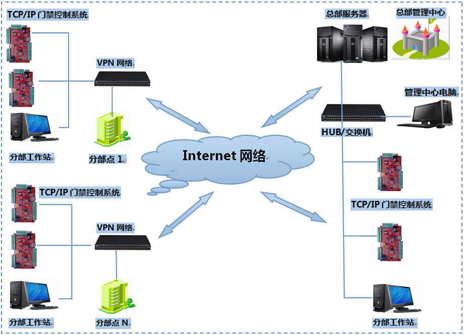 ◆ Intranet企業內部網系統圖 本系統可通過充分利用企業內部網絡資源,實現企業內部網跨地域的集中式的統一管理系統管理,適用于單位地點分散在各個地區,但是單位內部擁有自己的企業網絡 ,如 網絡帶寬超過幾十兆,可以實現總部對分部的管理,也可依據設定的管理權限實現分部的自行管理。并能夠實現門禁數據的共享。例如:在某一地域內中的大型連鎖企業對各個下屬分支機構通過內部網組建的門禁系統的統一化管理。