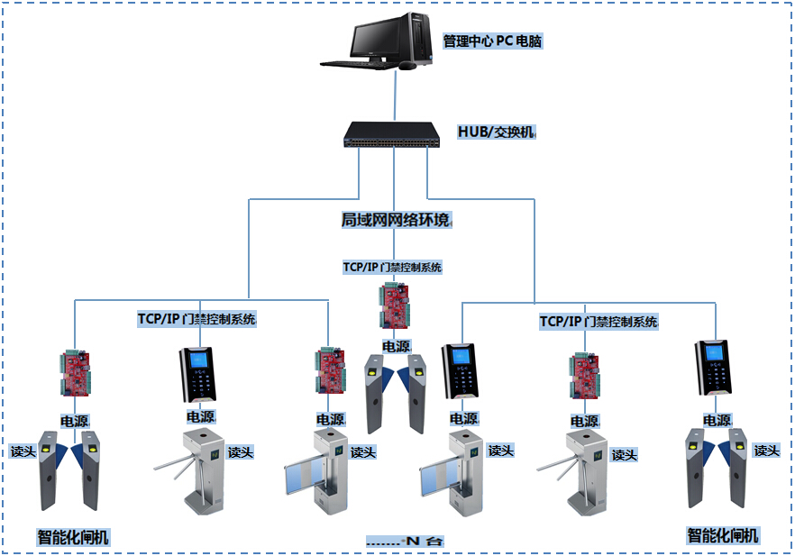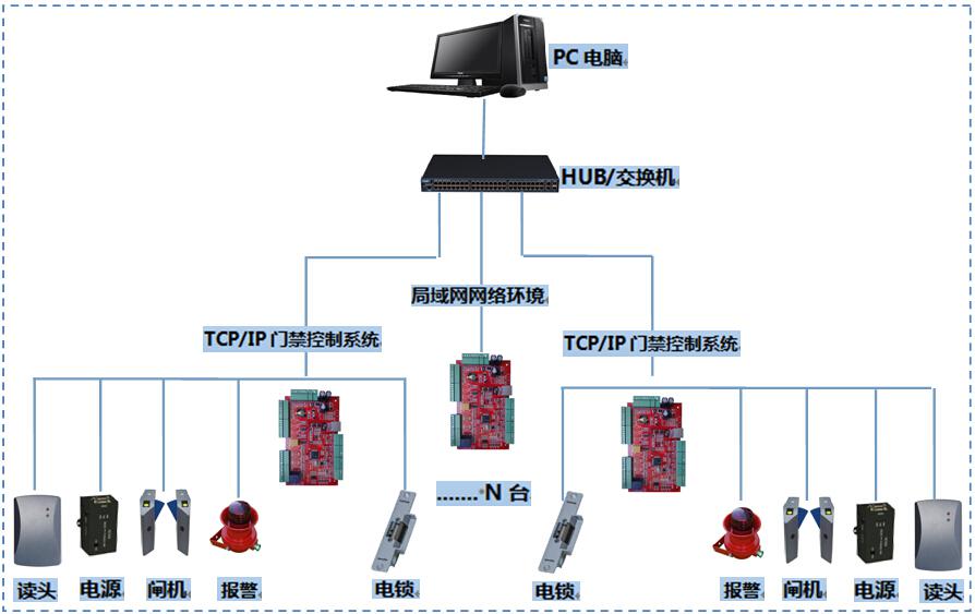 ◆TCP/IP局域網系統圖 適用于單位控制場所比較集中,要求統一管理,對性能要求較高,還具有通安裝更簡單、訊速度快、系統抗干擾性強、聯網數量不限等優點,屬于當前普及性的主流型應用架構,特別適合內部具有原有局域網絡,無須重復布線的中大性用戶選用,只要內部具有局域網網絡,通過一定的權限設置,任意一臺電腦都可以實現對控制器進行管理,實現單位內部統一的局域網管理。