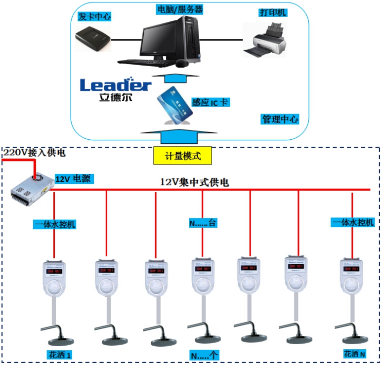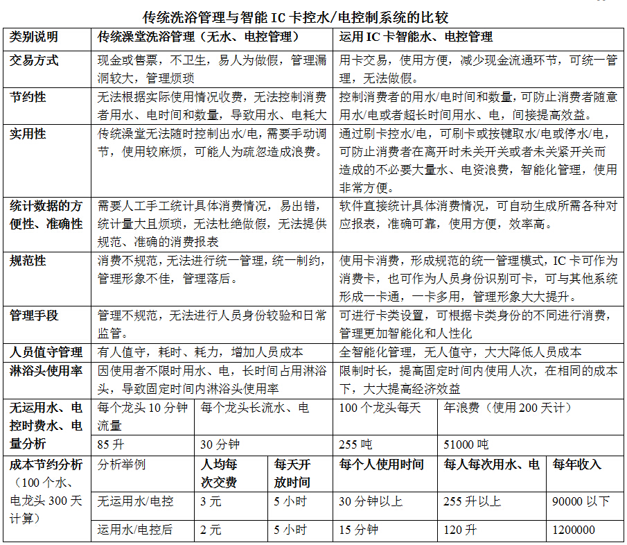 我公司經(jīng)過廣泛的市場調(diào)研和深度分析,經(jīng)過長時間的大量的實踐和努力自主開發(fā)了智能IC卡水控系統(tǒng),并在社會上廣泛使用。此產(chǎn)品的推出可讓用戶按管理需求實現(xiàn)個性化用水,給水資源管理者提供了科學(xué)有效的解決方案,時同也是為國家能源節(jié)約提供新的思路。我公司研制的感應(yīng)式IC卡節(jié)能控制系統(tǒng)不僅能達到節(jié)約用水/用電,同時能達到提高效率、合理收費、科學(xué)管理、信息共享的目的。深受廣大用戶的歡迎。同時,可以為當今能源節(jié)約提供一種新的思路,為資源合理利用提供了可能。 選擇使用我公司生產(chǎn)的IC卡控水收費系統(tǒng),可通過計量或計時模式的科學(xué)收費,科學(xué)有效的控制用水,可節(jié)約用水80%左右,避免了無謂的浪費;同時使用者合理、精確的收費,解決了現(xiàn)金收費帶來的管理漏洞和諸多不便問題,避免了使用澡票帶來的繁瑣和一張澡票洗半天的浪費現(xiàn)象。使用者持卡洗澡,絕對的實行了誰用水誰付費,用多少付多少合理收費的原則,合理公平分配了用水,養(yǎng)成使用者勤儉節(jié)約的習(xí)慣,減輕了合作單位或后勤部門的經(jīng)濟負擔。同時由于本系統(tǒng)的搭建,為今后實行一卡通平臺系統(tǒng)搭建了網(wǎng)絡(luò)平臺,可實現(xiàn)一卡通名數(shù)據(jù)的統(tǒng)一管理和信息共享,使得管理更加科學(xué)化,精細化、集中化,徹底改變了單位后勤部門管理混亂、數(shù)據(jù)資源統(tǒng)計繁瑣,管理落后、信息化資源分散的舊局面,為科學(xué)、有效化、智能化、信息化大數(shù)據(jù)的管理奠定了基礎(chǔ),大大提高了使用單位的管理效率和提升了單位信息智能化管理的形象和檔次。